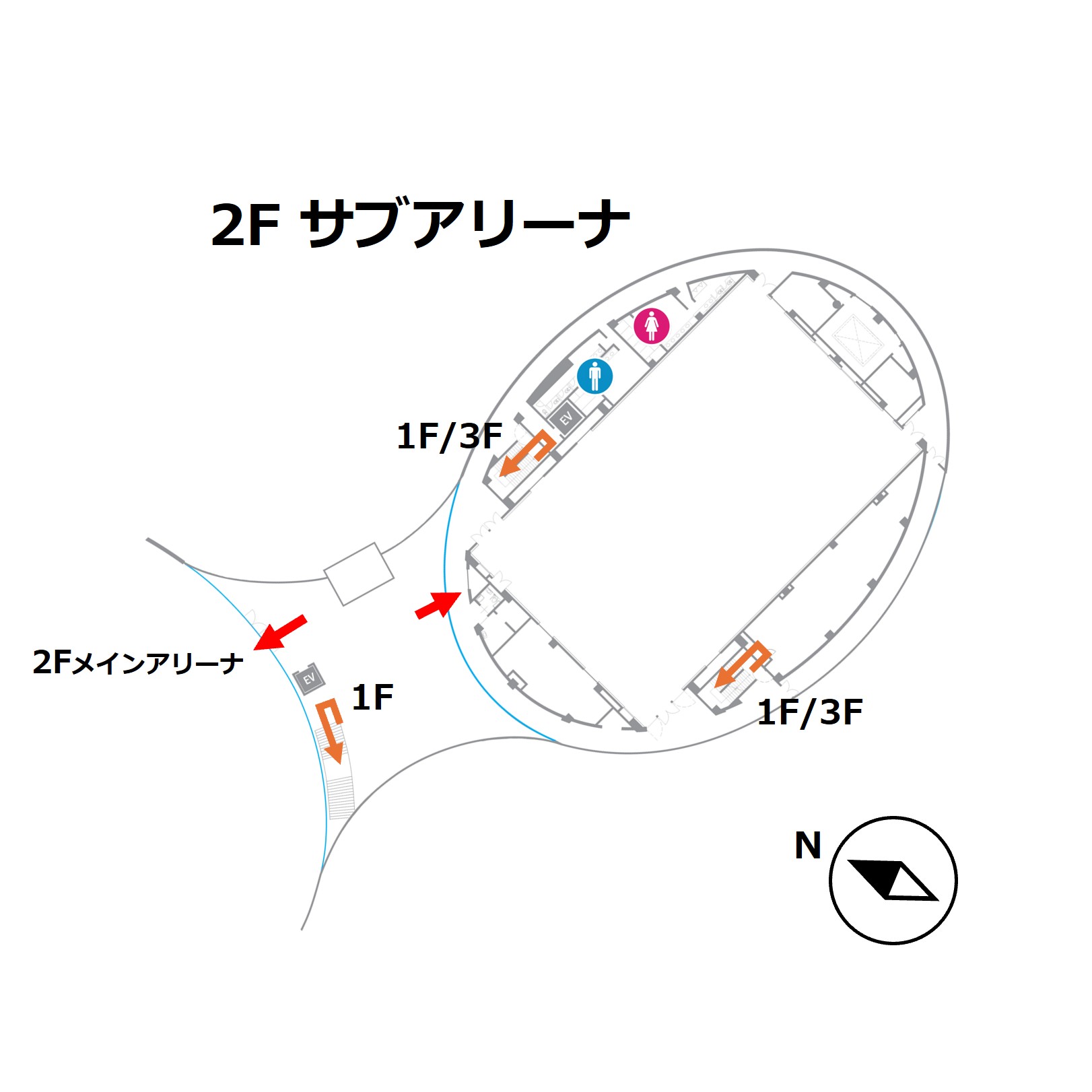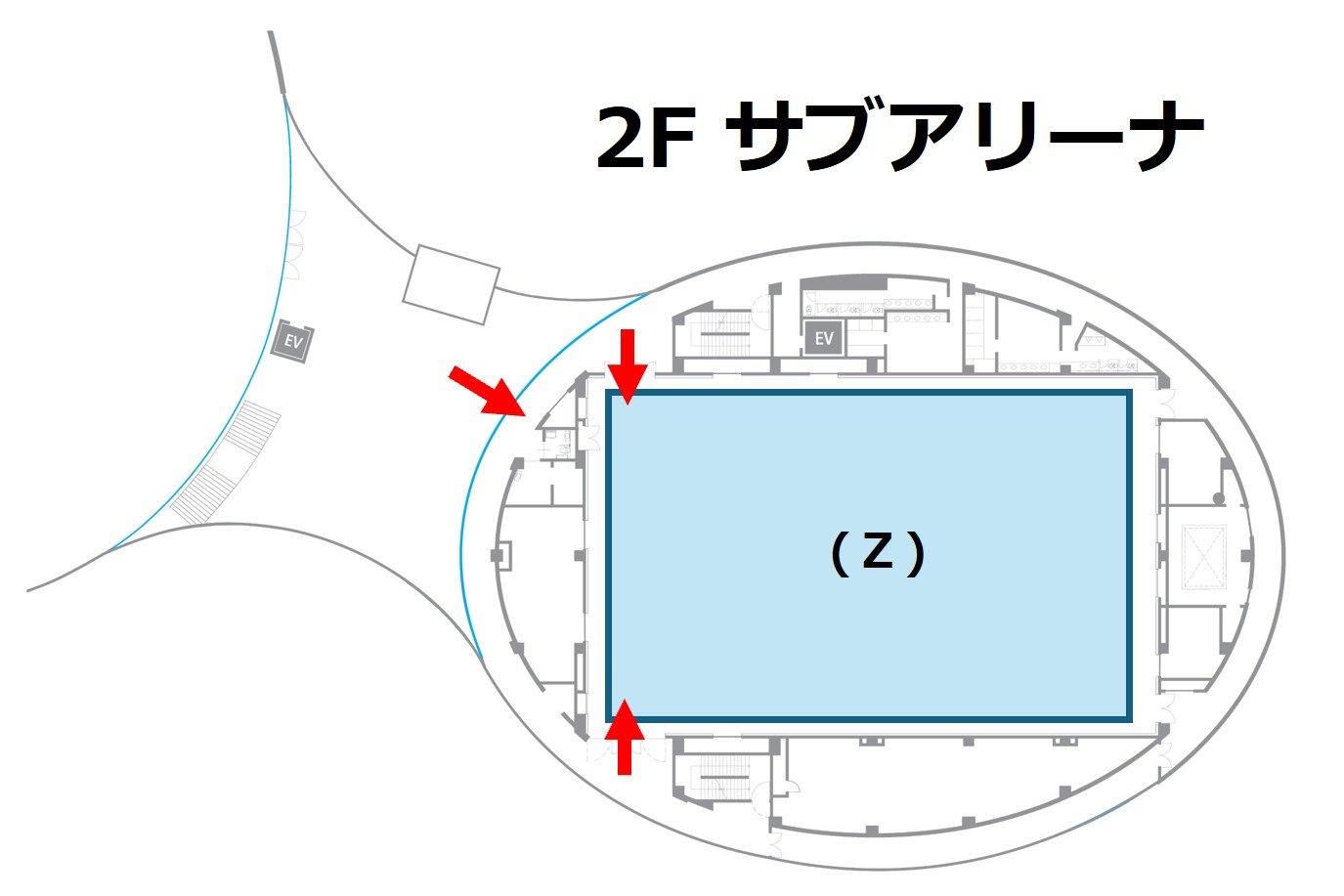 ※ 3階にも座席 (約200席)がありますので、2階が混雑時にはサブアリーナの両側の階段より3階にお上がりいただき、3階席をご利用ください。
